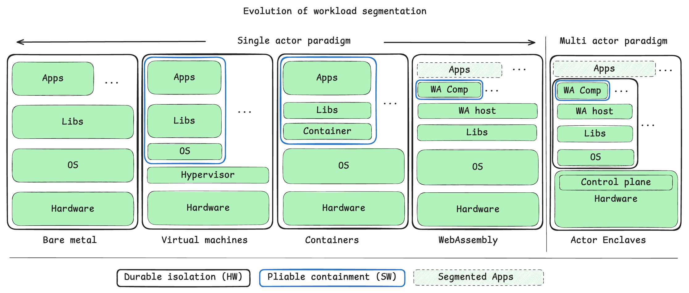 This all leads to the following perspective on the evolution of workload segmentation where software mechanisms contribute “pliable containment”, and hardware contribute “durable isolation”. Of course, software isn´t always compromised, but we are considering guaranteed sustainability of capabilities here. This does not mean that pliable containment is useless, but it is a risk. I do realise that the following model takes a swing at every actor framework out there by grouping all of them in the “single actor paradigm”. The goal is not to claim that they are wrong, but to show that they could do so much better with a scale out von Neumann architecture than they are with the current crop of scale up von Neumann architectures.