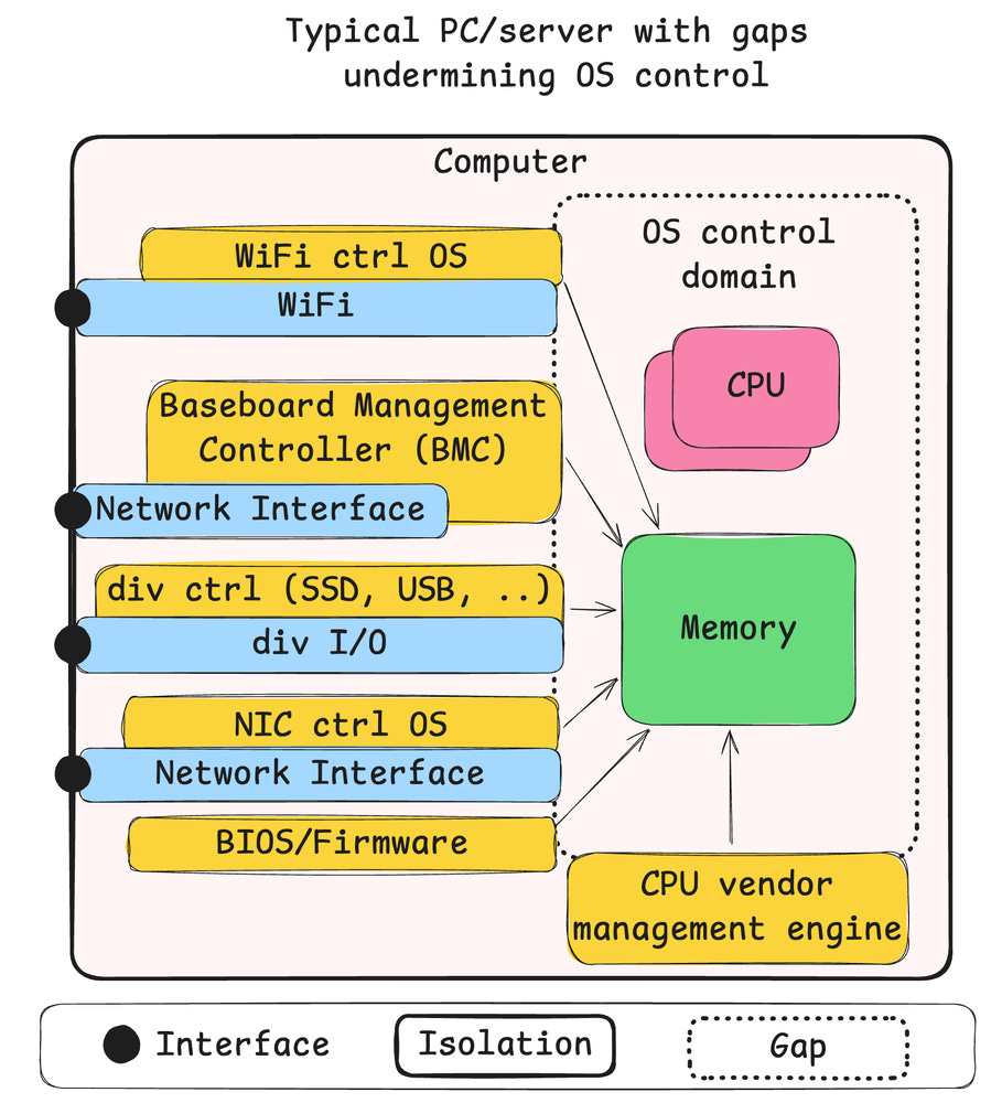 The PC can be thought of as a single actor with multiple compute elements, many of which are completely out of your and OS control. This is perhaps a reason why coming up with a reasonable model for computer security tends to fail. There simply is no way you should be able to reason about the security guarantees of systems designed like this, because there obviously aren’t any.