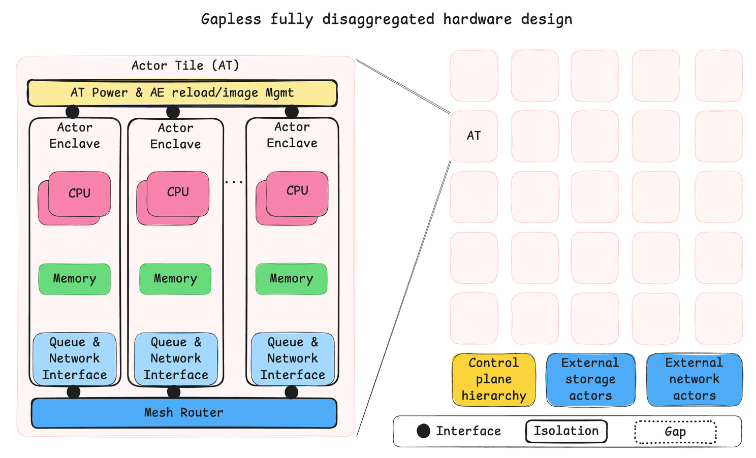 The big insight is that using the actor model allows for fully disaggregated hardware design and arbitrary scale. This breaks the current chains of the scale up von Neumann architectures that perhaps exists almost purely because of the incentives created by backwards compatibility.