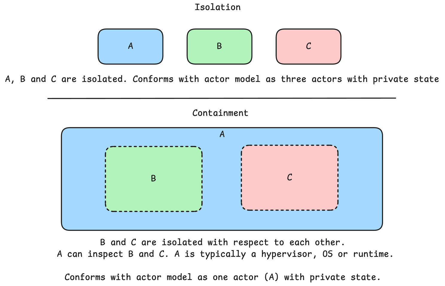 Assume that A gets compromised and modified to gain functionality like inspecting B, and C if it couldn´t already or to allow B and C to interact with each other’s internal state directly. The software-based containment capability is pliable, not durable. Software based actor frameworks can´t really guarantee what the actor model prescribes. They have “happy-path-actors”, it is fine, until it isn´t.